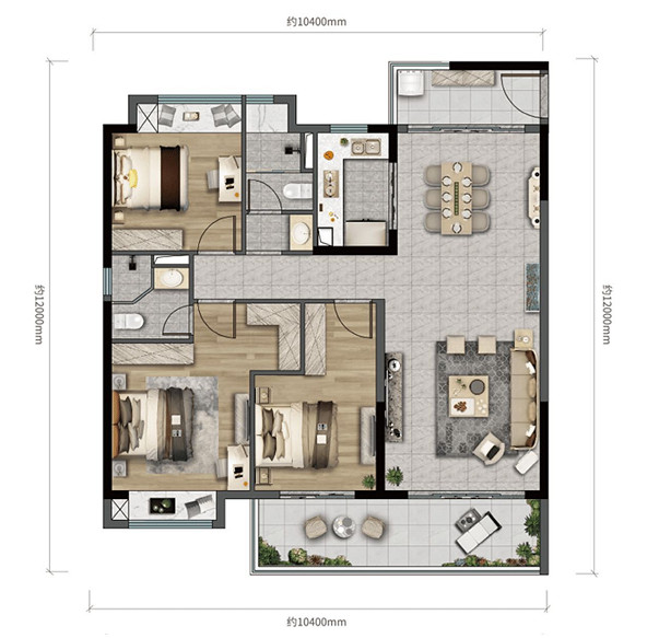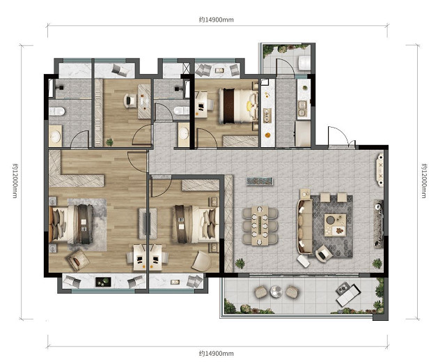客厅和次卧南向连接宽景阳台,可以打造成两个功能分区,一半是生活阳台,一半是休闲阳台,洗衣晾晒和休憩赏景,互不冲突。