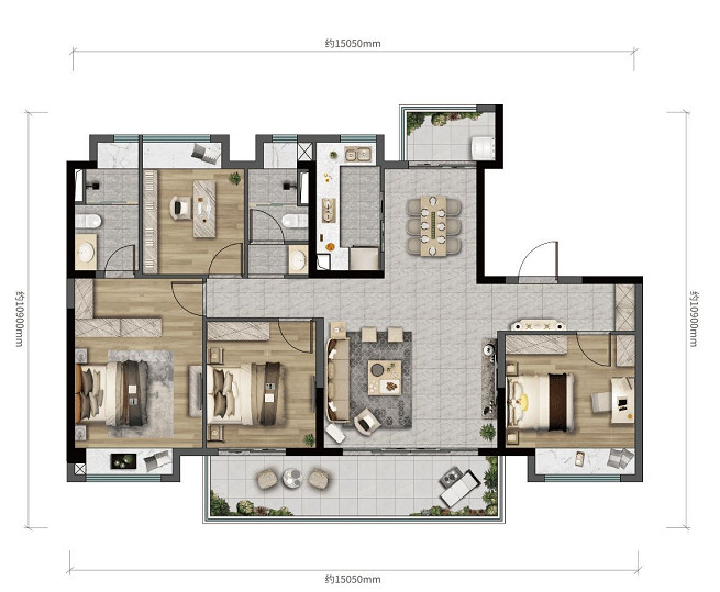 【观棠】户型建面约152㎡,为四室两厅一厨两卫双阳台设计;该户型空间敞阔、居住舒适、注重细节,对于追求美好人居体验的业主来说,足以安放幸福生活。