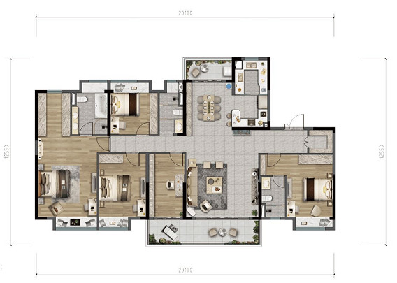 【锦著】户型建面约216㎡,为五室两厅两厨三卫双阳台设计;该户型在尊重阳光、重视私密、布局阔朗、居住舒适、注重细节等多方位均满足了不同的家庭需求。
