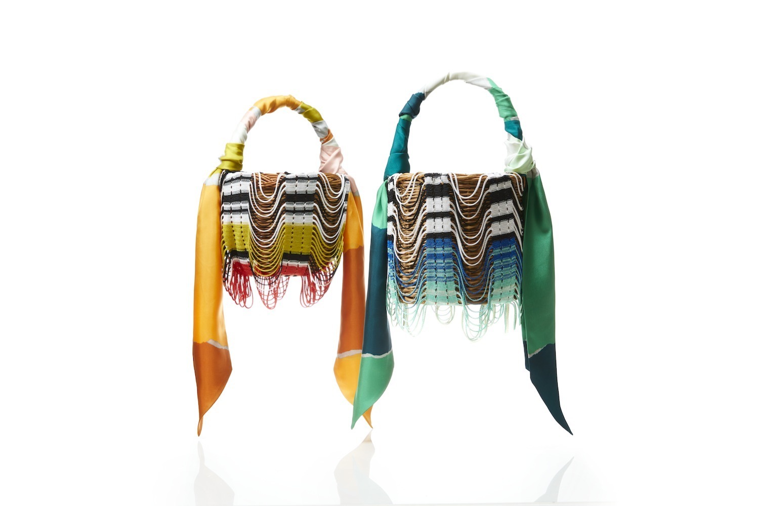 MISSONI将手工编织的藤艺篮用作包袋框架,以此来展现夏季田野的悠闲气息。同时,色彩明亮而柔软的丝巾被包裹在篮子的手柄处,并在数款包袋外侧用密集的彩色流苏来点缀,伴随着走动步伐而摇摆的模样带有着浓郁的地中海风格,展现出浓郁的意大利式热情。