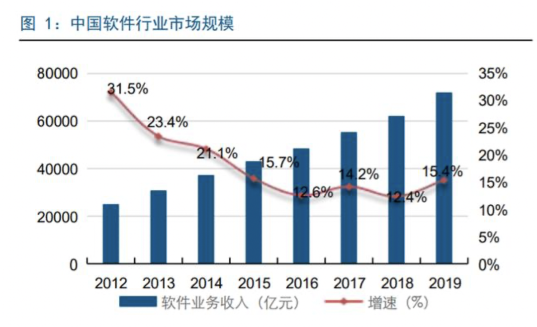 长江证券的研究报告表明,2019年我国软件行业实现营收71,768亿元,同比增长 15.4%;实现利润总额 9,362 亿元,同比增长 9.9%,规模巨大。