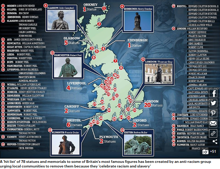 在轰轰烈烈的“清算活动”中,英国一个名为“推翻种族主义者”(Topple The Racists)的网站发布了一张地图,标记出境内78座被认为“歌颂种族主义和奴隶制”的雕像位置,包括查理二世国王和詹姆士二世国王等英国殖民扩张时期君主的纪念碑。
