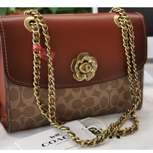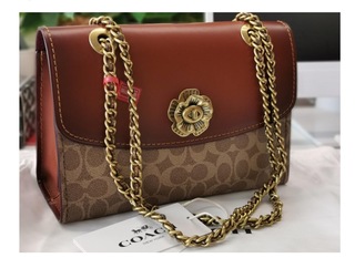 尤其是2018年春夏系列的Parker链条包,一诞生便成为大热门“IT包”,标志性的包扣是茶玫瑰花型,也被称作山茶花。作为Coach转型的标志性产品,Parker选用了品牌最经典的双C logo,再用不同皮质、拼色来体现它的时髦感,体现新老交替、承继经典的设计理念。