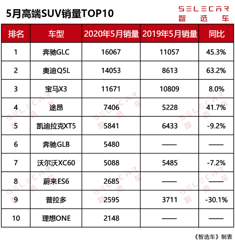 ①2020年5月份,奔驰GLC再次蝉联高端SUV市场销冠,同时它还取得了45.3%的同比增长;