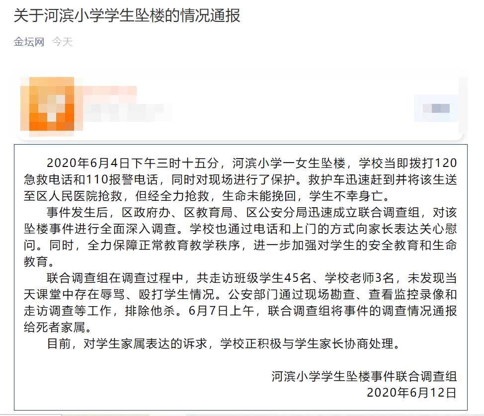 常州市金坛区广播电视台官方微信6月12日通报,2020年6月4日下午三时十五分,河滨小学一女生坠楼,学校当即拨打120急救电话和110报警电话,同时对现场进行了保护。救护车迅速赶到并将该生送至区人民医院抢救,但经全力抢救,生命未能挽回,学生不幸身亡。