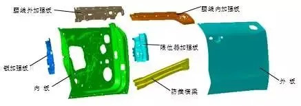 对于有框车门来说,它是由门外板、门内板、门窗框、门玻璃导槽、门铰链、门锁及门窗附件等组成。内板装有玻璃升降器、门锁等附件(并在门铰链处设计有加强件)。为了增强安全性,内板上还会安装有防撞杆。