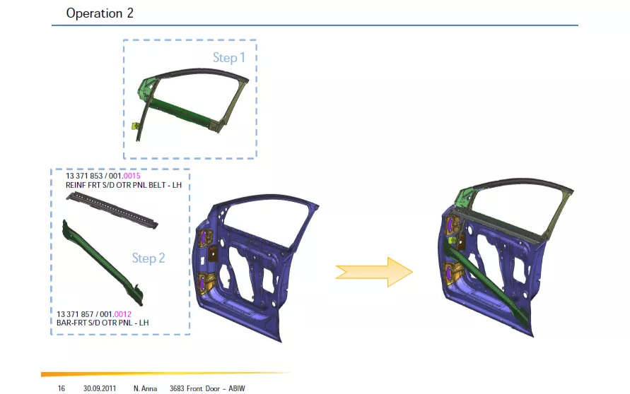 要问无框车门结构有何不同,首要是它没有下图“Step1”零件。“Step2”属于加强件,会保留,不过一般不会有其他特别的结构加强处理。