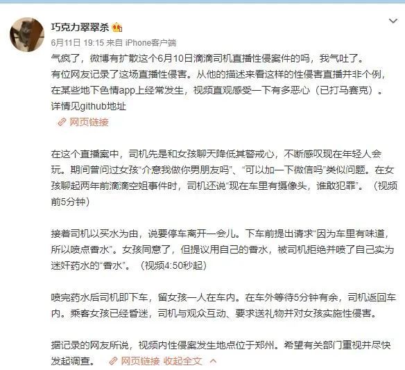 "巧克力翠翠杀"发布的微博引发巨大关注。有网友将该事件与滴滴此前频发的性侵案联系起来,认为滴滴管理依然存在漏洞。