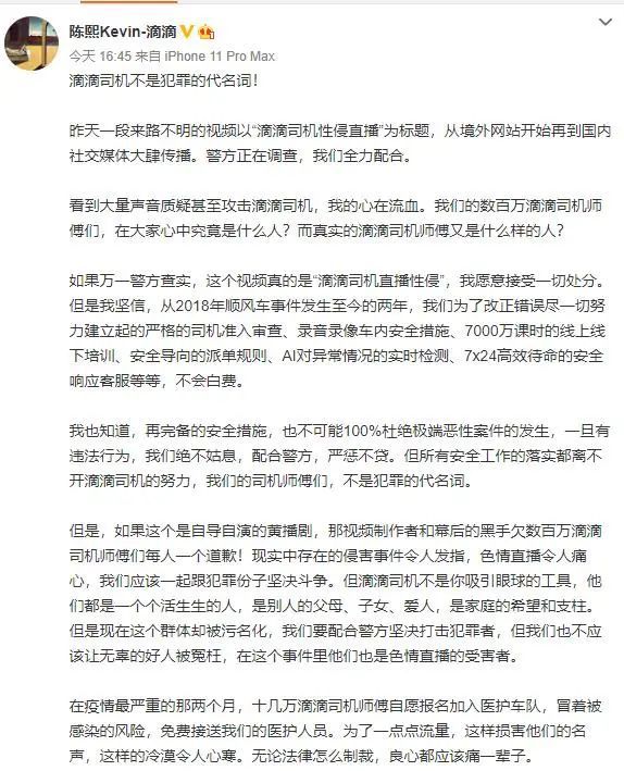 6月12日下午16:45,滴滴网约车总裁陈熙发布一条长微博,对疑似"滴滴司机性侵直播"事件进行回应。