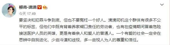 当天下午,滴滴出行总裁柳青,转发了陈熙的微博并评论:“要坚决和犯罪斗争到底,但也不要冤枉一个好人。”