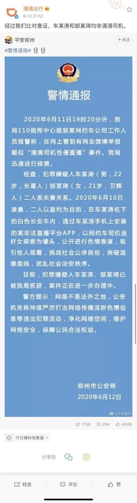6月12日晚,针对网传"滴滴司机性侵直播"事件,郑州市公安局发布警情通报,嫌疑人系夫妻,二人以盈利目的,在非法直播平台App以网约车司机迷奸女乘客为噱头,公开进行色情表演。目前,犯罪嫌疑人已被抓获。