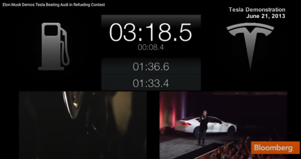 在一台奥迪A8油箱加满的3分钟里,两台特斯拉Model S满电复活。