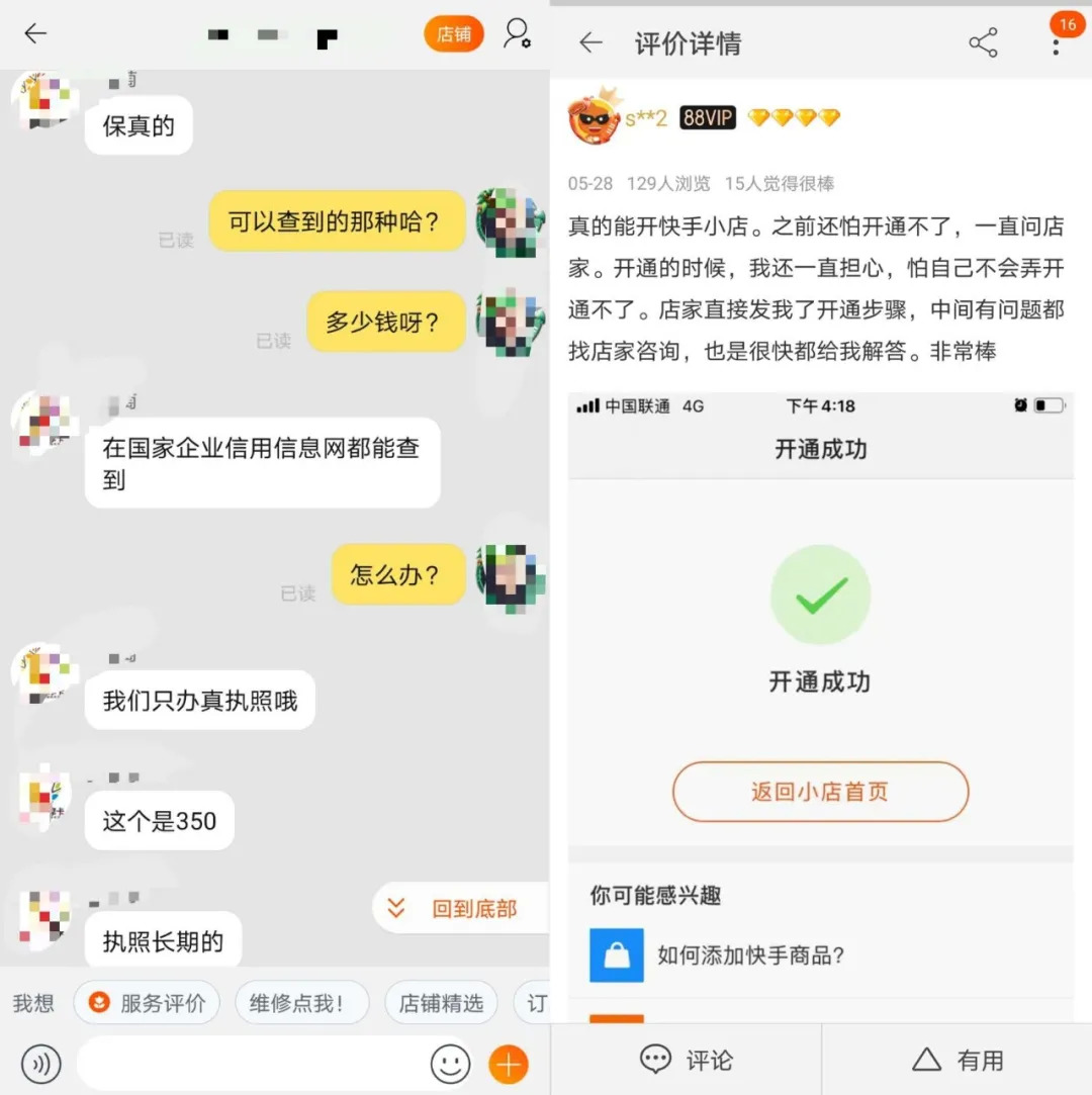 燃财经发现淘宝上也有不少快手、抖音小店营业执照代办的店铺。一位店主给燃财经的回复是,只需要提供身份信息即可,三个工作日内就可以搞定,价格只要350元。燃财经联系到了该商品链接的一位评价用户,对方称代开的营业执照“真的能开快手小店”。