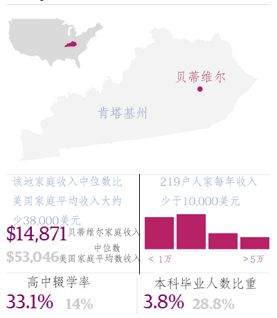 这些小镇中的其中一个典型代表就是贝蒂维尔(Beattyville)。根据美国人口普查记录,住在这里的1700人中98%是白人,同时它也是美国最穷的白人小镇。据最新数据——2008-2012年美国人口普查局对人口超过1000人的社区普查数据显示,贝蒂维尔是全国最穷的四个镇之一。所以,当《卫报》想要报道那些生活偏离了所谓充满机遇的美国梦的人时,他们挑选了这个地方作为第一站。