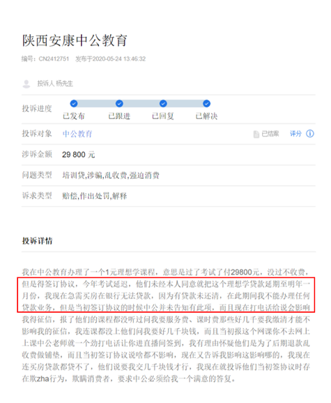 如下图所示,投诉人李先生表示,今年3月,中公教育吉林省四平校区招生老师向他推销了一款“2020吉林省考0元理享学”的课程。声称此业务为助学金、无利息,如果没有考上,全程不用掏一分钱,无任何影响。这引起了李先生的兴趣,在招生老师的指导下,李先生报名了课程。