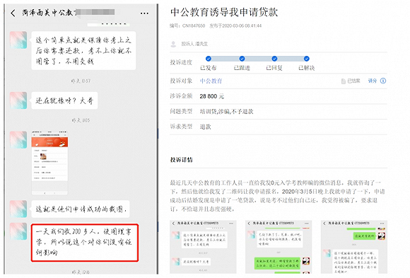 而“0元入学”则成为解决这个问题的办法。一位潘姓投诉人截图显示,中公的招生老师称,“理享学”每天至少招收200人。即使按潘姓投诉人给出的28800元学费计算(该课程费用相比前述投诉人涉及学费金额较低),中公教育一个月大概仅为学员办理贷款涉及的金额就有1.73亿元。