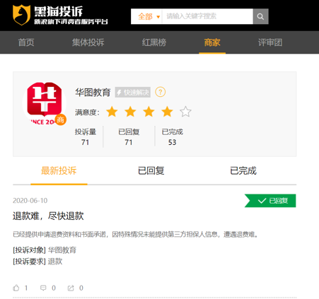 但让人意外的是,蓝鲸教育尝试搜寻中公教育竞品——华图教育/粉笔公考的“退费难问题”,发现关于退款难的投诉量要少好几个量级。以黑猫投诉平台为例,中公教育的投诉量高达1300,华图教育只有71,粉笔公考只有16。而在微博上,“华图退款难”、“粉笔退款难”都没有组建起话题。退费难似乎并非行业的普遍现象,反而像是中公教育的“独特风景线”。