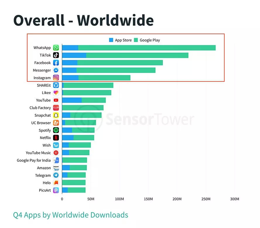 然而在其两款短视频产品Lasso和Reel反响平平的情况下,近期Facebook又以高薪雇用科技投资专家帮助其发现下一个社交风口,并尽早进行投资或收购以防日后涉及防垄断问题。凭借这个手段,Facebook曾将WhatsApp和Instagram从潜在对手变成了“小弟”,却仍未能阻止TikTok单枪匹马冲入大众的视线中。Sensor Tower数据显示,2019年Q4谷歌和苹果下载量总排行榜上的前五名里,TikTok是唯一一个非Facebook系的社交产品。