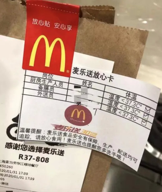 2月末生产生活逐渐恢复,麦当劳成为最早开始使用“安心卡”的餐饮企业之一,每一道工序的人员体温都测量、记录在在外送袋上。顾客拿到食物袋,就能直接看到制作过程的安心保障。后来,“安心卡”也在餐饮行业全面推广开来。须聪表示,麦当劳是连锁餐饮品牌,需要发挥行业影响力和社会影响力。