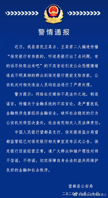 据河北望都县公安局微博消息,近日,我县居民王某占、王某君二人编造传播“保定银行有存款的,听说是银行出了点问题,有的话尽快取出来吧”的不实言论,引发公众恐慌情绪,造成不明真相的群众到保定银行提前支取存款,公安机关对相关违法人员均依法进行了严肃处理。