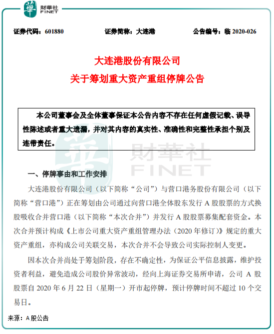 6月19日,大连港在港交所和上交所纷纷发布公告,称公司与营口港(600317-CN)正考虑由公司对营口港进行吸收合并及发行新A股股票募集配套资金。大连港在公告中提示,本次合并尚处于筹划阶段,存在不确定性,并宣布A股自6月22日(星期一)停牌,预计停牌时间不超过10个交易日。本次合并不会导致大连港实际控制人变更。