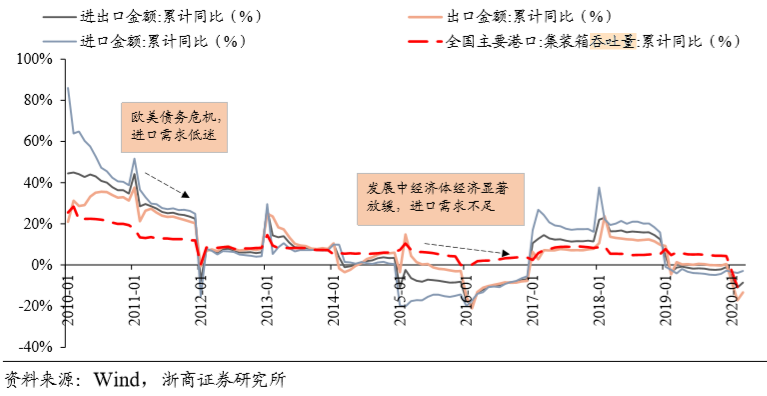 此外,我国港口面临着内外交困的压力。2010年以来,我国主要港口集装箱吞吐量增速乏力,增速下降至20%以下,甚至在2012年及2016年出现低单位数增长。2012欧美经济增长出现失速,加之就2018年来的中美贸易摩擦等原因,使我国主要港口集装箱吞吐量近十年来增长劲头不足,拖累业绩增长。