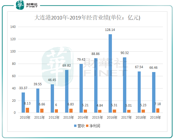 作为东三省的唯一出海口,辽宁省港口2019年的货物吞吐量为8.61亿吨,承接着东三省绝大部分货物吞吐量。大连港和营口港是辽宁最大的两个港口,在整合前,两港经常为争抢钢材等同一货源杀价,加之部分财务管理和业务管理方面未能形成有效统一,造成经营业绩出现波动。大连港在整合前的几年时间里虽然营收稳步增长,但是净利润却停滞不前。下图所示: