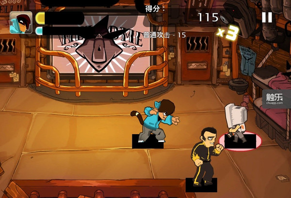 《Combo Crew》的画面带有很强的美漫风格,很容易让人联想到街头涂鸦和篮球,但实际上游戏本身却是个与《双截龙》《热血物语》很接近的街头格斗游戏。在《Combo Crew》里,我们不需要控制主角精确走位,只需要在看着不顺眼,好吧其实是必须要击败的敌人身上划一下,主角便会冲过去近身肉搏,玩家进行多点触控操作时还会使主角的招式发生变化,加之长按蓄力,短按防反的配合,玩家很容易的就能在划动与按压的操作中体会到与敌人周旋的紧张刺激感,这是常见的摇杆加虚拟按键操作无法传达的神韵。