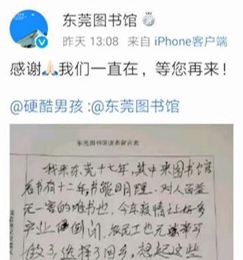 对于老吴的留言,东莞图书馆很快在官微里给了他回复:“我们一直在,等您再来!”。