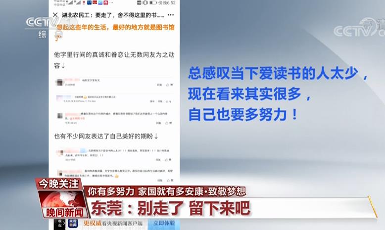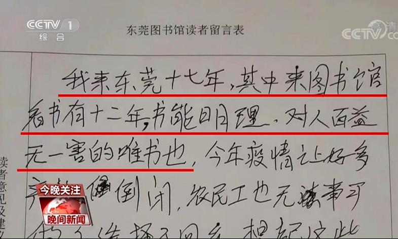 广东东莞图书馆读者 吴桂春:好像对我是个损失,因为看这书对我很有帮助,所以我在离开东莞,不能(在这里)看书了 。舍不得的就是图书馆,里面给了我好多的知识,或者给了我人生最好的心态。