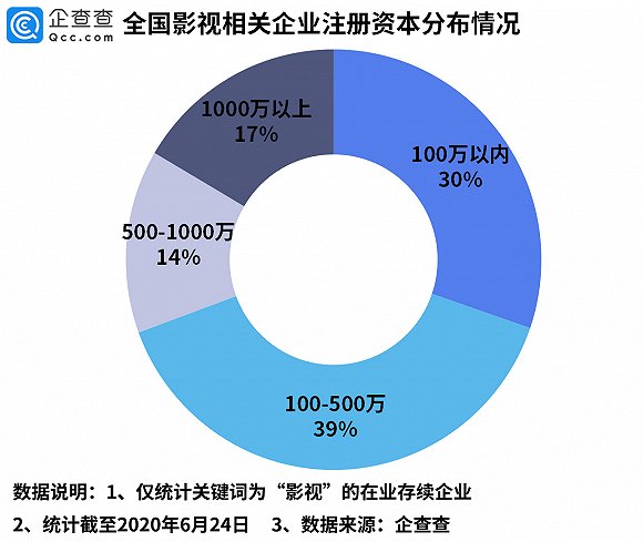 从注册资本看,企查查图表显示,注册资本在100万以内以及100-500万的影视相关企业占据行业的大多数,分别占总量的30%和39%,而注册资本在1000万以上的占17%。
