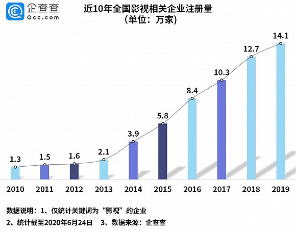 企查查数据显示,全国范围内共有76.5万家影视相关企业,其中在业存续的近60万家。近10年,全国影视相关企业注册量逐年递增,在互联网的推动下,2014年起行业进入快速发展阶段。2019年,相关企业注册量达14.1万家,较2018年增长了10.7%,是10年前注册量的近11倍。