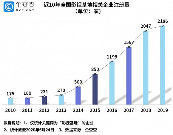企查查数据显示,全国共有10674家影视基地相关企业,其中在业存续的有9069家。近10年影视基地相关企业注册量逐年递增,2018年注册量突破2000家,同比增长28%,2019年达到2186家。