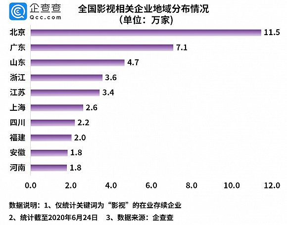 地域分布方面,企查查数据显示,北京拥有的影视相关企业数量最多,达11.5万家,远超其他省份,广东与山东分列二三位。