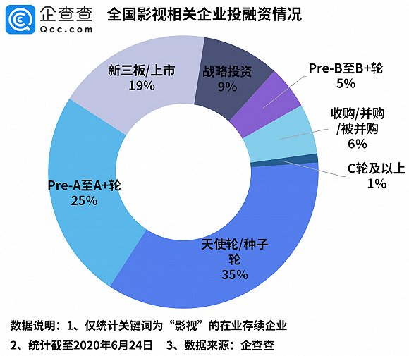 从投融资情况来看,企查查数据显示,融资轮次在天使轮/种子轮的影视相关企业数量最多,占总量的35%;Pre-A至A+轮次之,相关企业占总量的25%;新三板/上市的影视相关企业则占总量的19%,而融资轮次在C轮及以上的仅占1%。