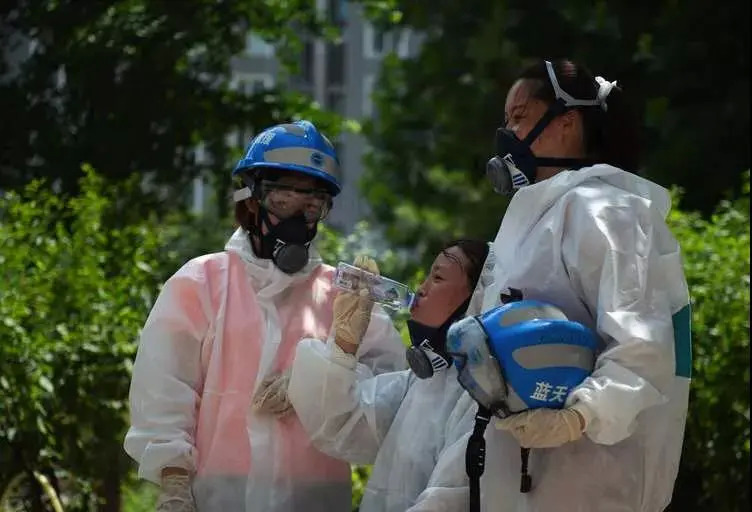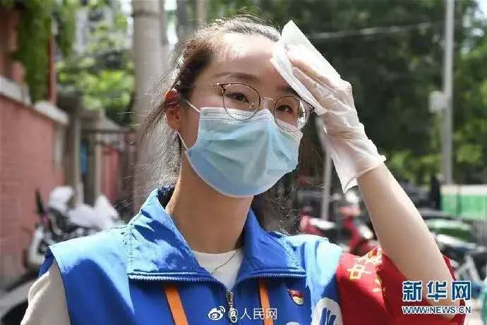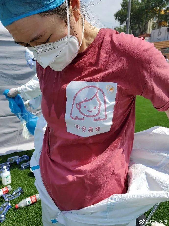 当天,北京气温超过30度,医护人员在烈日下穿着防护服进行咽拭子采集。