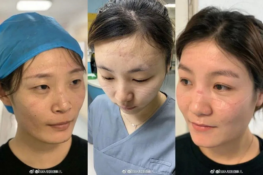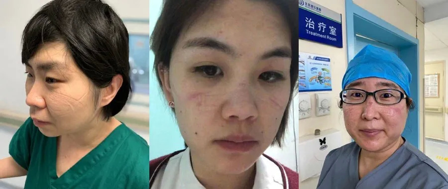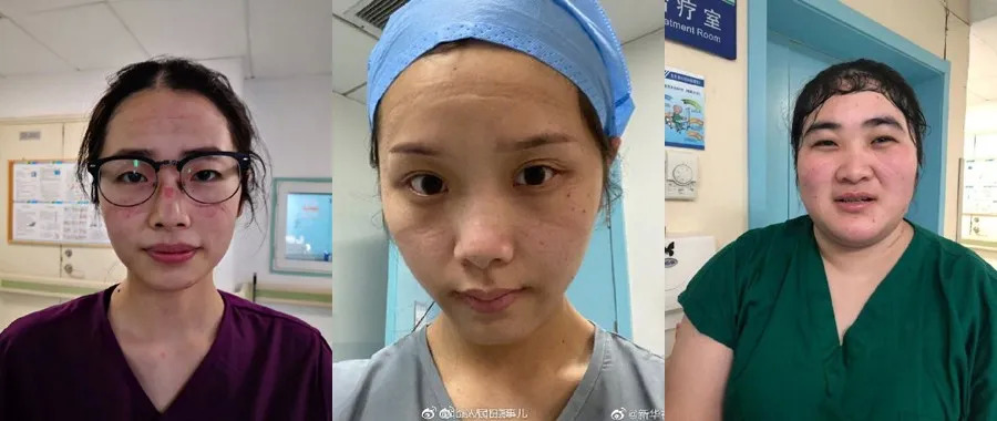 北京地坛医院收治了大量确诊病例,医护人员们脱下防护服后,脸上压痕清晰可见,可她们却依然面露笑容,这是他们勇气的勋章。