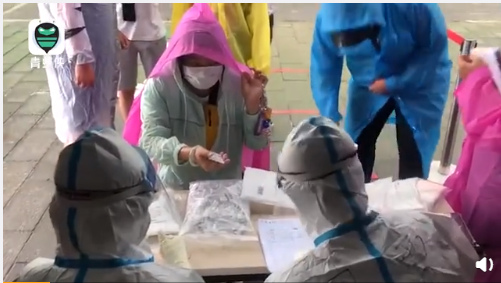 6月18日,北京一核酸检测现场突降暴雨,采集员小姐姐雨中坚持工作,并表示:“大雨都不是事儿,热也不是事儿!”