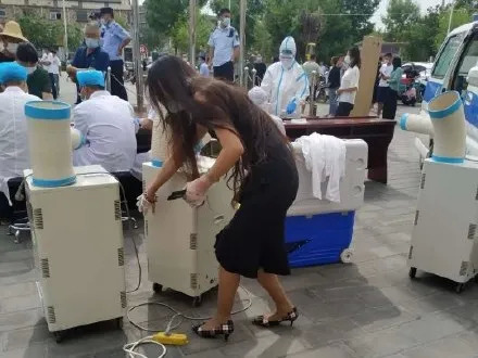 近日,在新发地附近,一位护士在给市民做核酸检测时中暑晕倒。餐厅女老板刘宁看到这些情况后,特别心疼这些医护人员,便从餐厅里搬来四台冷气机,放到就近的医护人员身边。