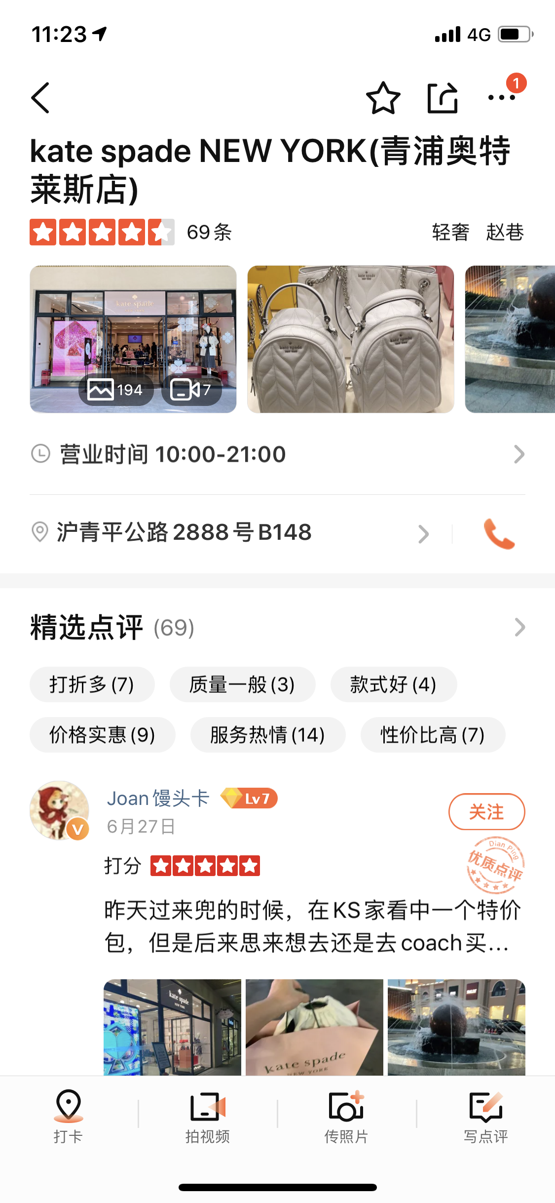 傅女士前去消费的,是位于上海青浦奥特莱斯的Kate Spade门店,其在大众点评上获得了四星半的高分好评,评论多称所售产品“低价”、“划算”和“性价比高”。