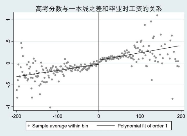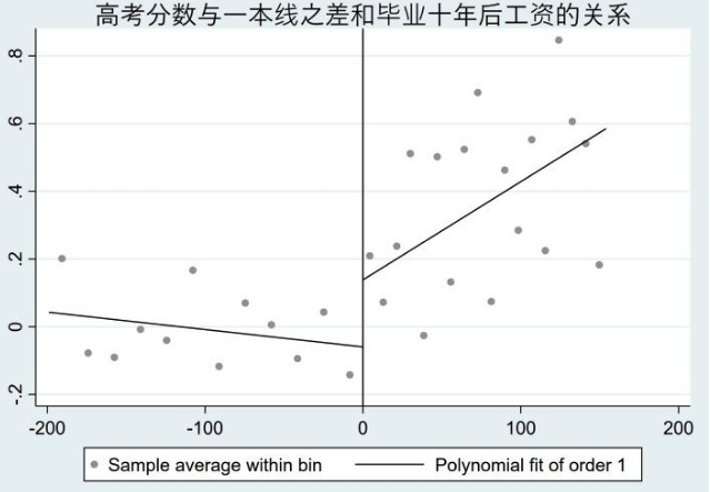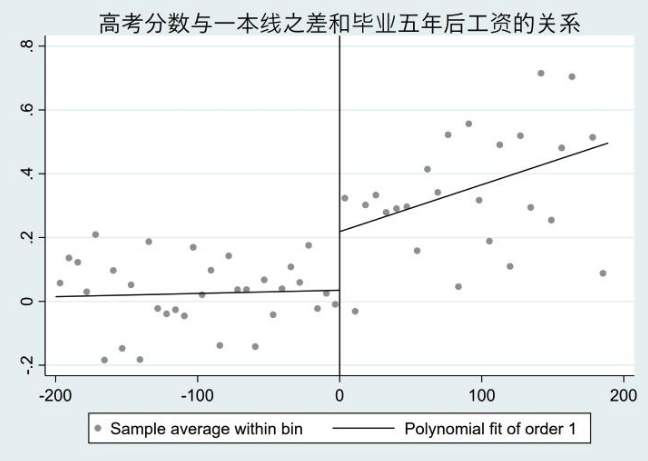 上图我将带宽扩大到了上下200分,此时一本学校和二本学校的工资差距,用断点回归方法可以算出约6%的差距,可以理解为两条直线在一本线上的截距之差。若是使用二阶段回归,结果为30%。两个计算均与贾瑞雪论文得出类似结果。