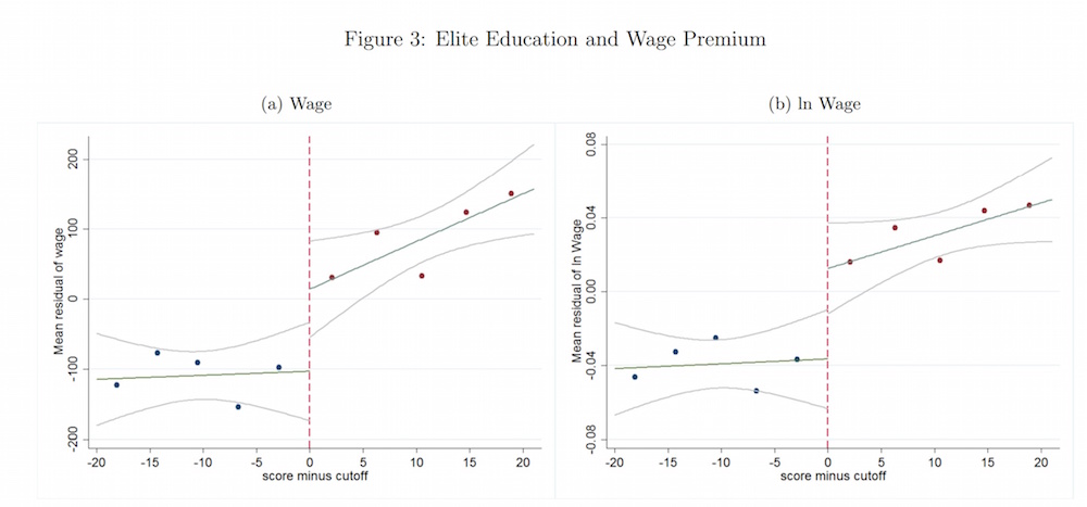 上图的红色虚线代表每个学生当年高考时的一本分数线,横轴表示的高考成绩比一本线高出20分或者是低20分,左右两图的纵轴分别为工资水平或者对数工资水平(去除了毕业年份与工作省份的固定效应)。