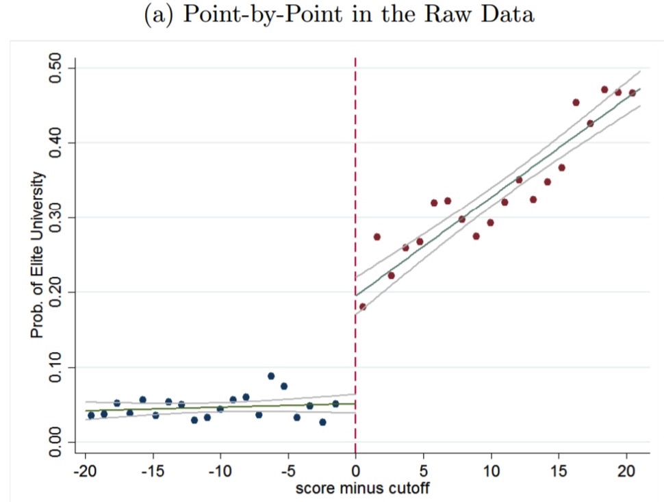 对于高考来说,断点回归十分合适。首先,高考考分是连续的,从0分到750分,一分一档;其次,高考考分具有一定随机性,一个水平在500分左右的考生,在高考时勉强超过500分(少错一题),和刚好低于500分的概率是差不多的(多错一题)。