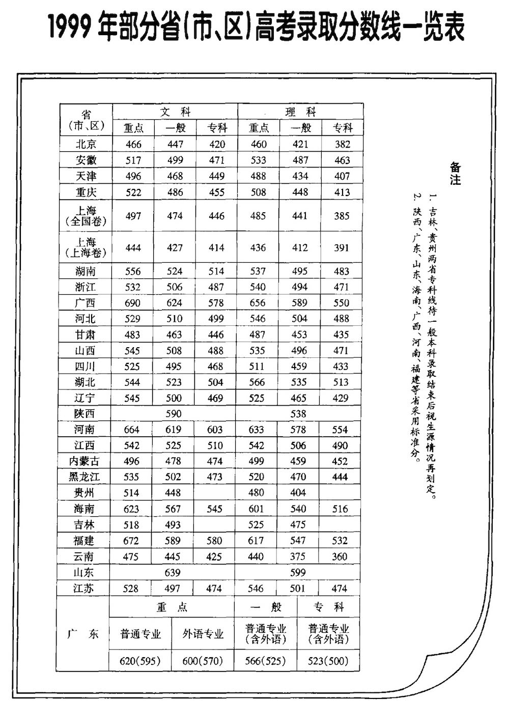 我另外搜集了从1998年至2018年所有年份各省文理综合卷的一本分数线,很多年份已经很难收集,但一些较早年份,由于当时的全国高考试卷仍然统一,也呈现出了不少有趣的点,比如1999年是这样的:
