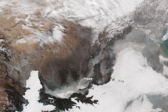 美国太空总署(NASA)12月30日公布的一张中国上空的卫星云图清晰地显示了此次雾霾的严重程度。从图上看,北京上空被一团灰霾笼罩,这团灰霾从北京向西南呈带状延伸,关中平原地区尤为明显。