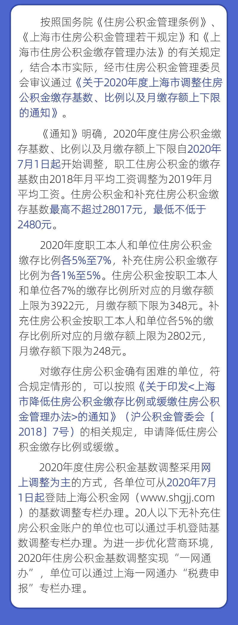 根据市住房公积金管理委员会审议通过的《关于2020年度上海市调整住房公积金缴存基数、比例以及月缴存额上下限的通知》(以下简称《通知》),2020年度住房公积金基数调整从7月1日开始。