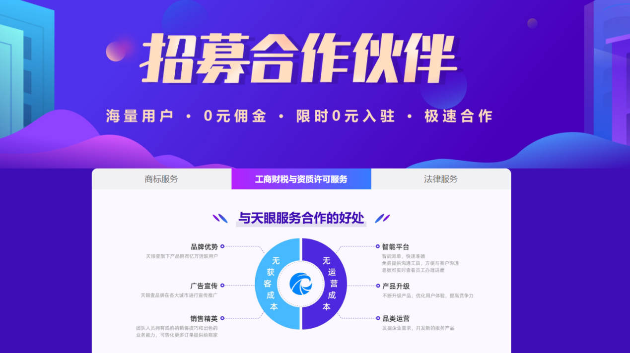 从“查公司,查老板,查关系”到“查公司,开公司”,天眼查广告语变化不仅意味着自身业务升级,更代表着“互联网+”的现实解决方案:把以前依托于线下交易方式的企业服务放到平台上,一方面解决用户找不到放心服务的痛点,另一方面解决服务商找不到客户的困境,让信息流动起来,让交易方便起来。这个思路收效显著,短短半年间,天眼查已从商业安全工具升级为商业安全平台,目前已有超过300万名企业主通过天眼查实现注册公司、注册商标、委托代理记账和法律咨询等100多种业务。随着平台用户需求迅速扩大,天眼查现在决定将已验证成功的经验分享给更多企业服务从业者,公开招募合作伙伴,0元佣金,限时0元入驻,共同做大企业服务市场。
