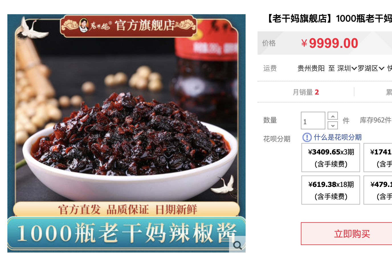 似乎是一种回应,7月2日,老干妈恰巧上架了1000瓶“大客户专属”的辣酱,定价9999元。目前,这一商品尚无销量。