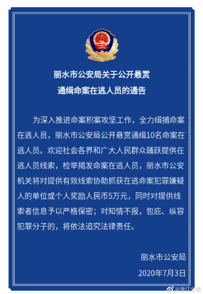 浙江省公安厅官方微博7月5日消息,丽水警方公开悬赏通缉10名命案在逃人员,悬赏总额50万元。