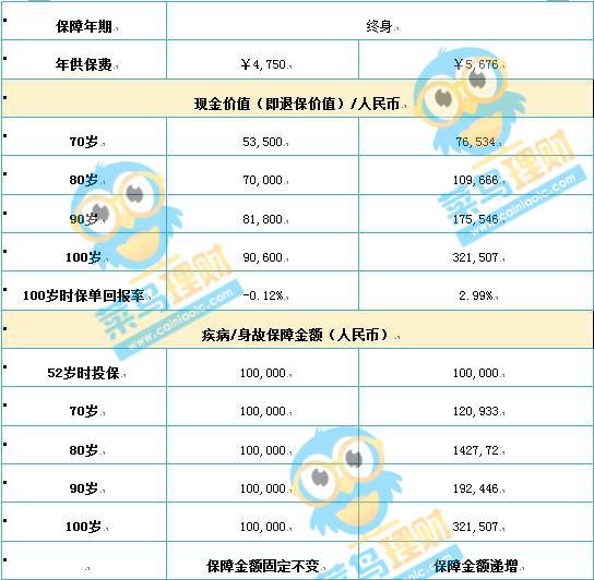 两款重疾险,均包有终身寿险保障成分。国内A公司重疾险的保障金额固定为10万人民币,不会随着现金价值的滚存而增加。而香港A公司重疾险的保障金额会在基本保障额10万人民币的基础上随着现金价值的滚存而不断增加,即假设80岁申请赔付,可获赔付并不是原先的100,000人民币,而是142,772人民币,这与内地保单通常只赔付原保额的做法不一样。
